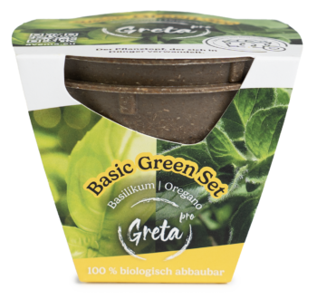 Das Saat-Set GRETA enthält einen Pflanztopf, der aussieht, als wäre er aus Kunststoff. Tatsächlich handelt es sich um ein inovatives Produkt, das aus natürlichen Materialien wie Miscanthus-Fasern, stabilisierten Kollagenfasern, pflanzlichen Succinaten und natürlichen Wachsen hergestellt wurde. Der Pflanztopf zersetzt sich innerhalb weniger Wochen im Boden, fördert das Wurzelwachstum und versorgt die Pflanze mit Stickstoff und den Boden mit Humus.